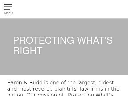 136. Baron & Budd, P.C. Baron & Budd - National Plaintiffs' Law Firm & Trial Lawyers A national plaintiffs' law firm active in litigating cases including mesothelioma lawsuits, pharmaceutical, class actions and environmental contamination.