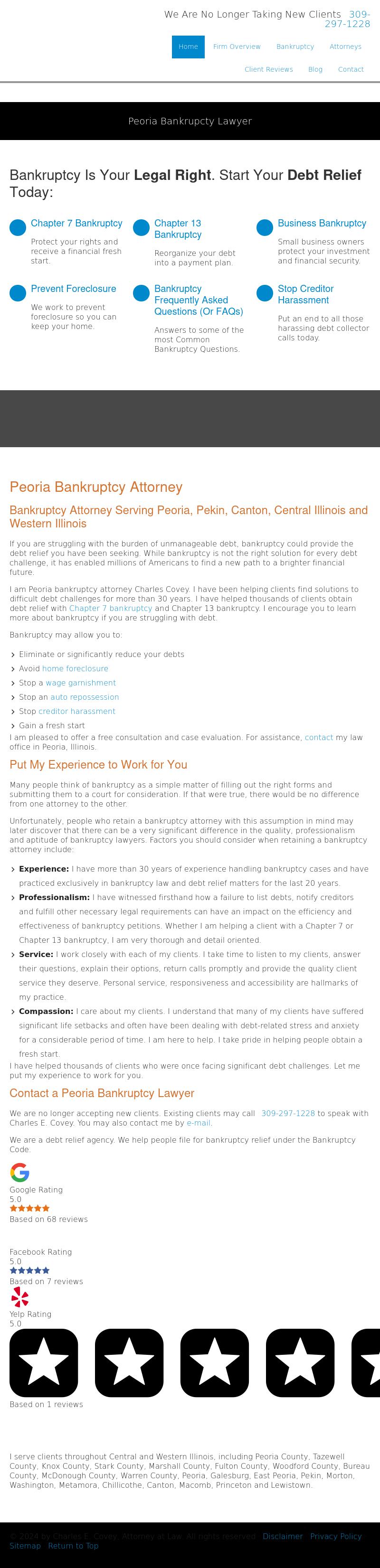 Charles E. Covey, Attorney at Law Peoria Bankruptcy Lawyer Charles Covey | Free Bankruptcy Consultation 309-740-0392 Bankruptcy Attorney with more than 30 years of experience in Peoria, IL. Call 309-740-0392 to contact attorney Charles Covey in Peoria, Illinois.