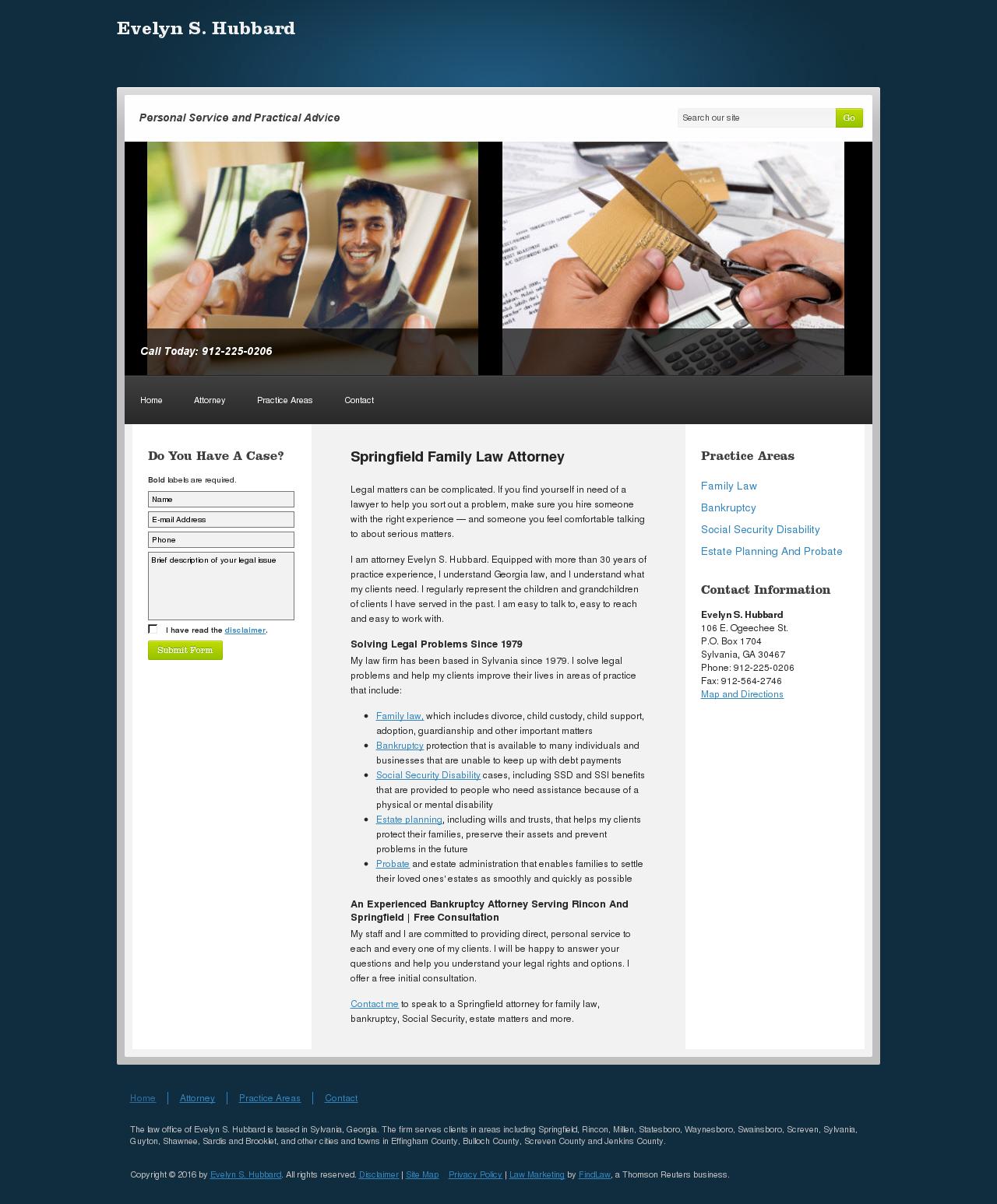 Evelyn S. Hubbard Springfield GA Family Law Attorney | Rincon Bankruptcy Lawyer | Effingham County SSD & Estate Law Firm The Springfield, Georgia, law office of Evelyn S. Hubbard provides assistance with many types of legal matters. Call 912-225-0206 for a free consultation.