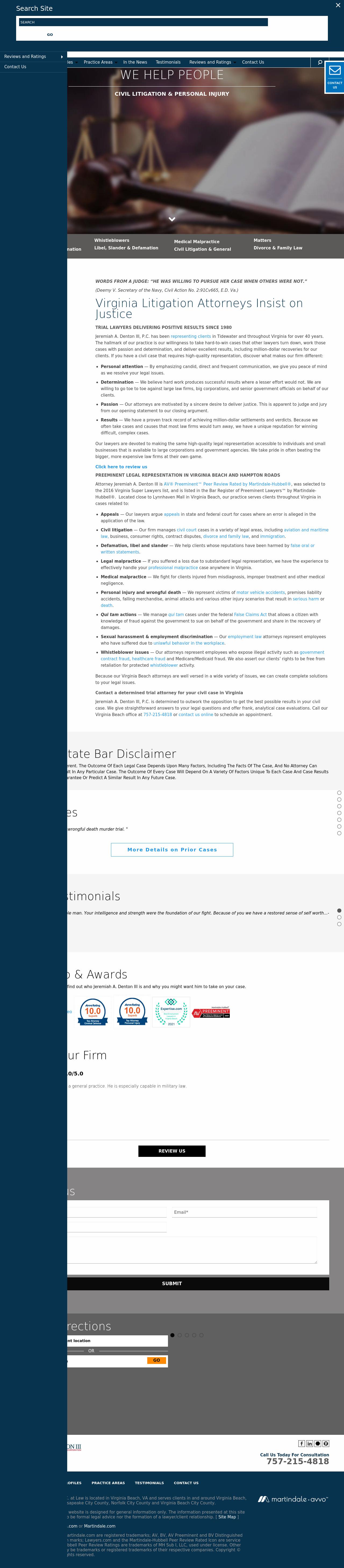Law Office of Jeremiah A. Denton III Virginia Defamation, Personal Injury, and Sexual Harassment Lawyers Experienced Defamation, Legal Malpractice and Sexual Harassment Lawyers. Call for a consultation with a lawyer at Jeremiah A. Denton III. They work with clients in Virginia Beach, VA,