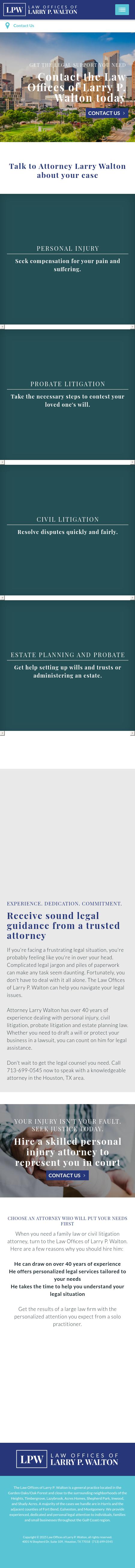 Law Offices of Larry P. Walton Houston Probate Lawyer | Estate Planning Attorney Personal Injury Texas TX Gulf Coast Since 1976, Houston, Texas attorney Larry P. Walton has handled probate, estate planning, personal injury and business litigation. Call 281-760-4985 to schedule your free initial consultation.