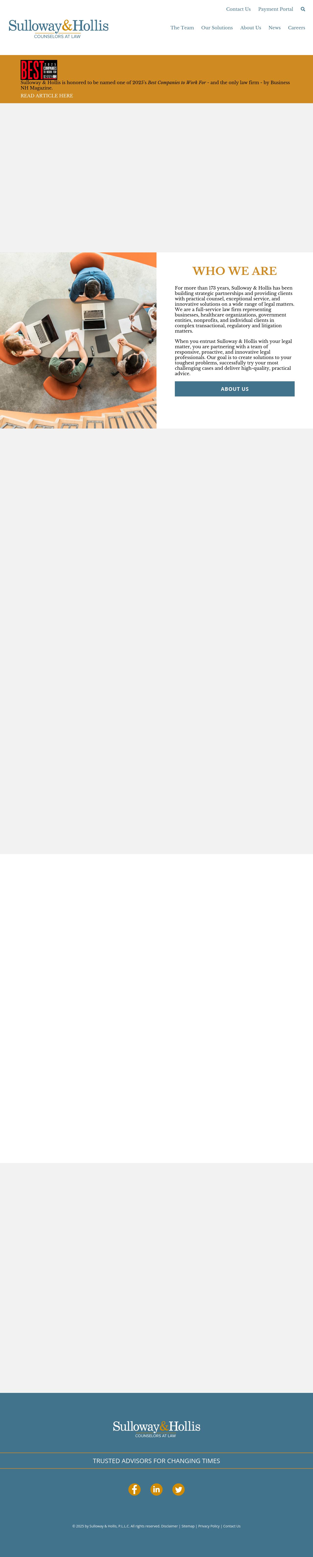 Sulloway & Hollis, P.L.L.C. Sulloway & Hollis, P.L.L.C. - Sulloway & Hollis As a preeminent law firm in northern New England, Sulloway offers a wide range of services to our clients. Our lawyers represent businesses, public entities, non-profit organizations, and individuals in business, regulatory, and litigation matters. We recognize that all legal issues a client faces do not fall neatly into one practice area, so we work collaboratively to deliver comprehensive legal solutions tailored to our clients' needs.