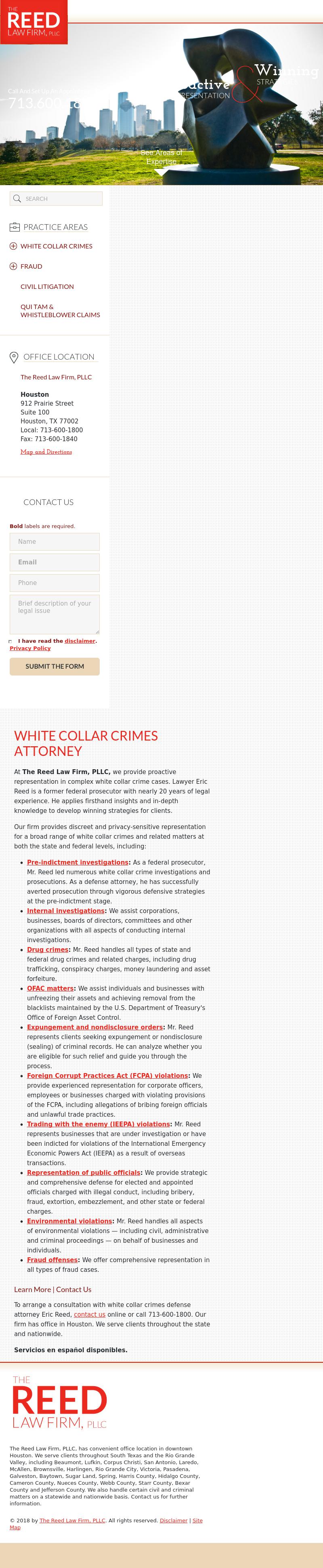 The Reed Law Firm, PLLC Houston Fraud Attorney | Rio Grande Valley White Collar Crimes Lawyer | Harris County Federal Crime Call Houston-based fraud defense attorney and former federal prosecutor Eric Reed at 713-600-1800 for proactive representation in civil and criminal cases.